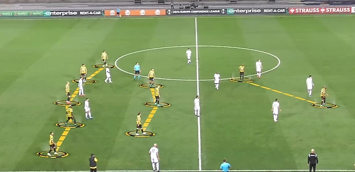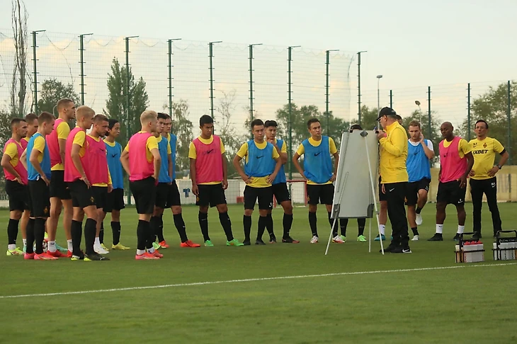 В первую очередь, схема: с четырех защитников в линию «Кайрат» перешел в три центральных с двумя латералями на краях. В средней линии играет тройка центральных полузащитников с определенными функциями, впереди двое нападающих. Аналогичная схема 5-3-2 (или 3-5-2) использовалась Бердыевым в российских командах «Рубин» и «Ростов».