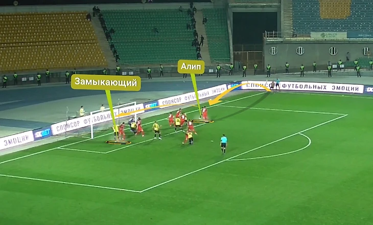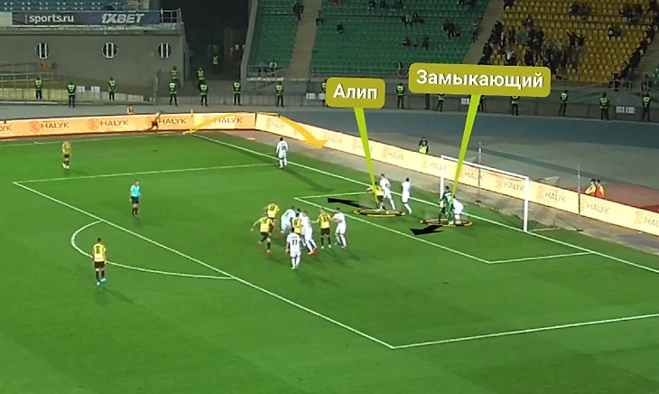 Один из примеров розыгрыша — подача на ближнюю штангу, где всегда открывается Нурали Алип. Его задача чиркнуть мяч на дальнюю штангу, где есть замыкающий игрок. Так «Кайрат» забивал «Кызыл-Жару» и «Кайсару».