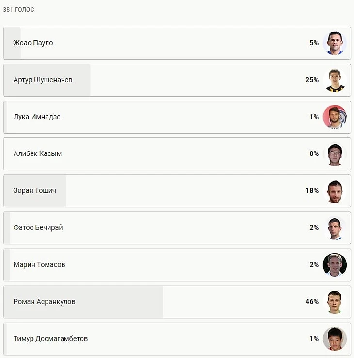 Победителем опроса стал защитник «Тобола» Асранкулов: его выбрали 46% пользователей.