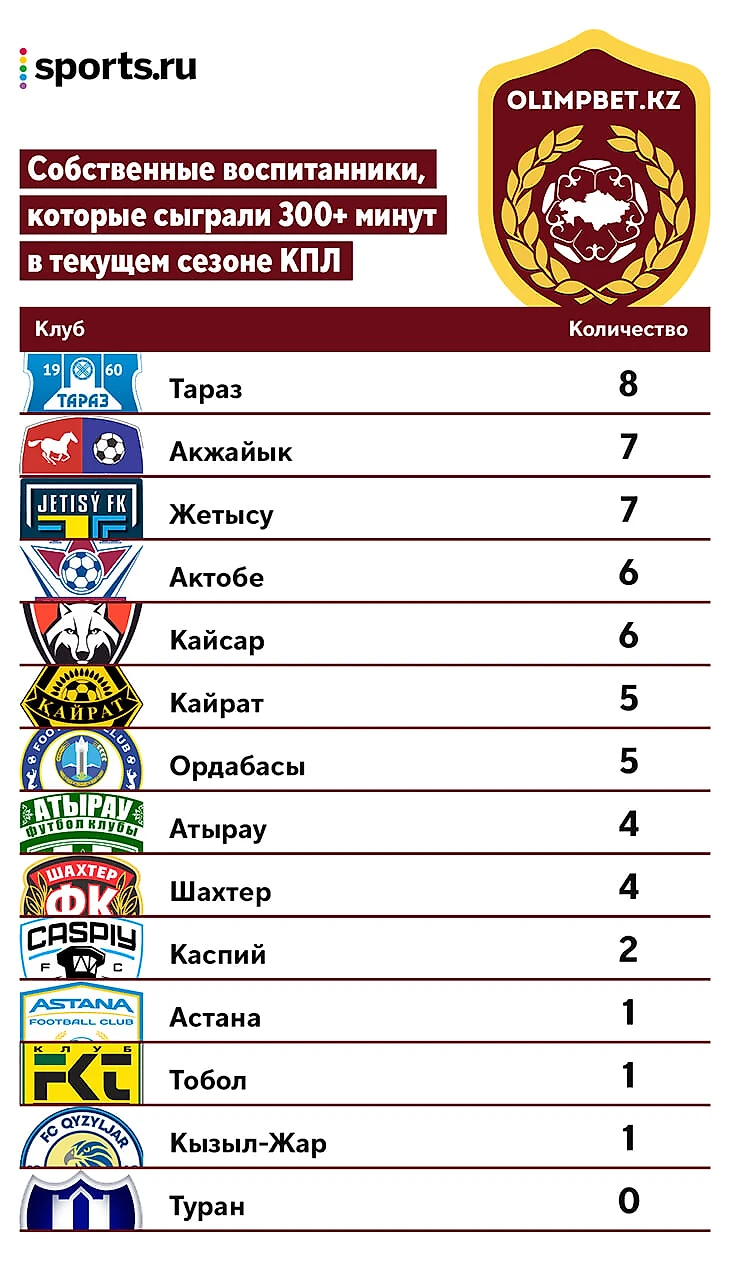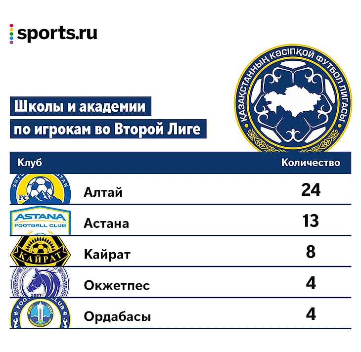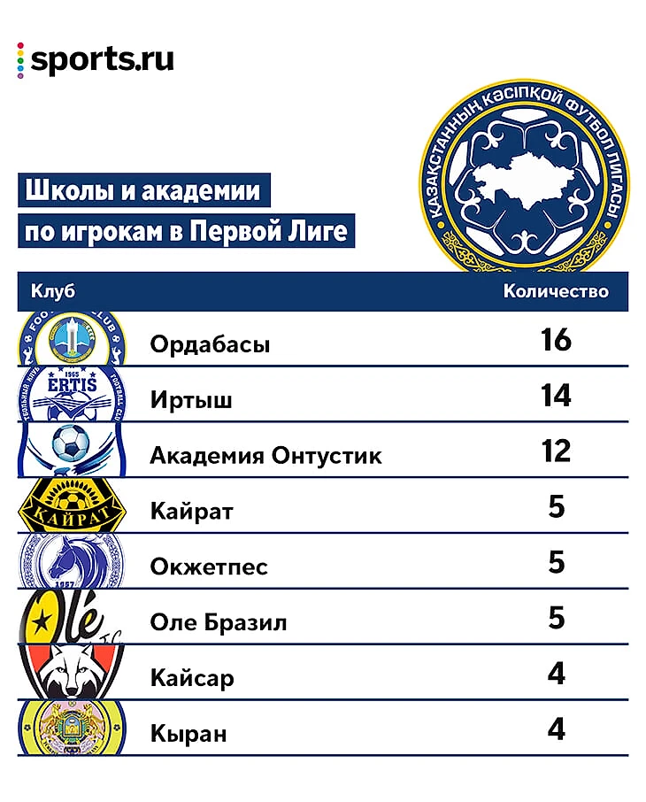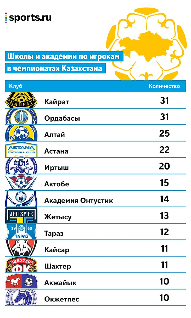 Больше всего воспитанников в казахстанские клубы воспитали «Кайрат» и «Ордабасы» (по 31), после идет «Алтай» с 25 воспитанниками. Но в случае с восточно-казахстанской командой есть оговорка: 20 из них играют в самом клубе.