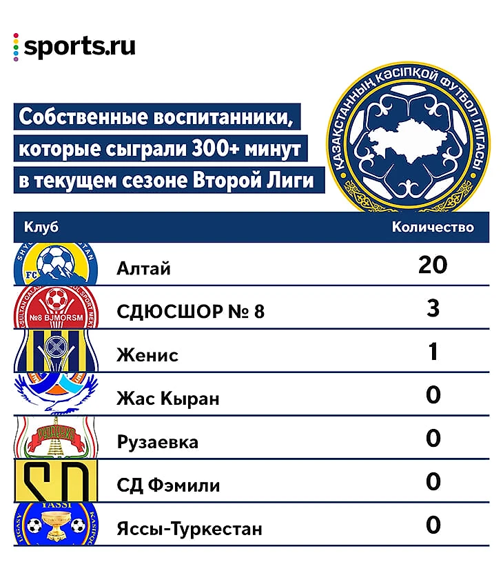 Как и могли догадаться, по количеству воспитанников во Второй лиге лидирует «Алтай» (24), второе место занимает «Астана» (играют в других столичных клубах — в «Женисе», «СД Фэмели» и СДЮСШОР №8), на третьем «Кайрат» (семеро воспитанников представляют алматинский «Жас Кыран»).