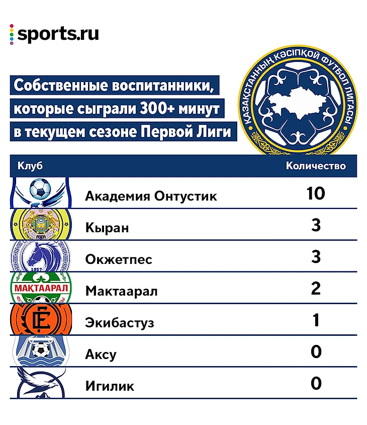 В Первой лиге интересная ситуация: почти все клубы не доверяют своим воспитанникам. Исключением и лидером с большим отрывом по воспитанником своей команды — «Академия Онтустик» (10).