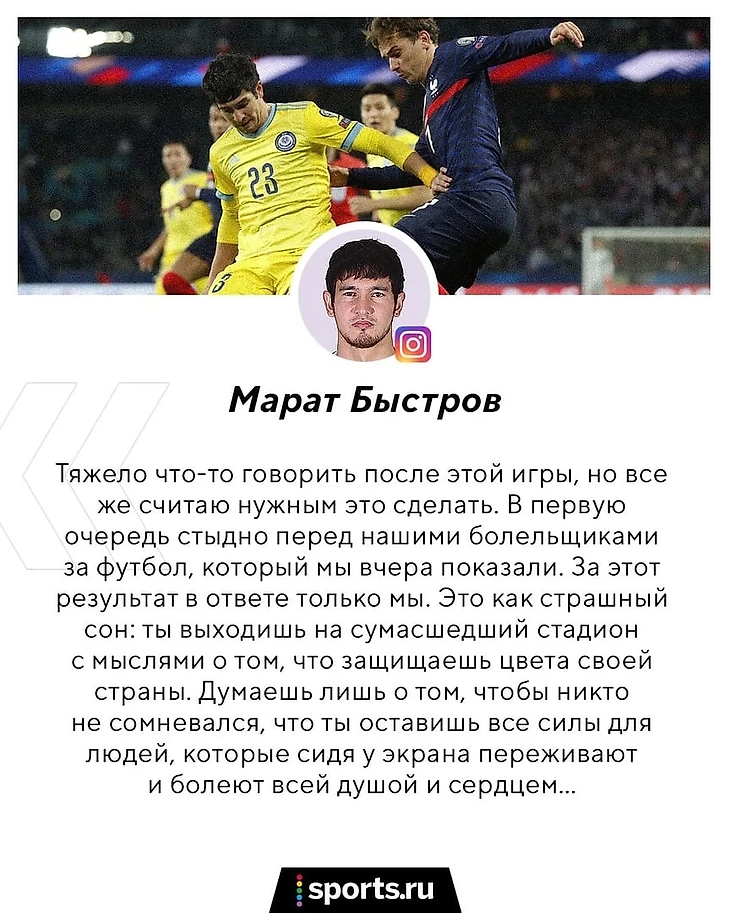 Да, мы не такие футболисты, которыми вы нас хотите видеть. Но увы, это наш уровень на сегодняшний день (против лучшей команды мира). Там, где мы могли добиться положительных эмоций для вас, для наших болельщиков, мы добились. Я надеюсь и верю, что наши с вами дети, молодое поколение будут лучше нас и добьются намного большего успеха во всех сферах и нам не придется переживать такие моменты, как вчера», — высказался казахстанский защитник.