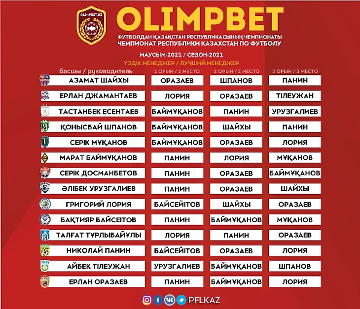2021 жылғы маусым қорытындысы бойынша Қазақстанның кәсіпқой футбол лигасы үздік менеджерді анықтау мақсатында отандық клуб басшылары арасында сауалнама өткізді.