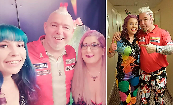 С такими прическами он играет всегда. Это кадр с финала ЧМ против англичанина Майкла Смита (он выглядит гораздо скучнее), справа от Райта как раз трофей, который он выиграл второй раз.