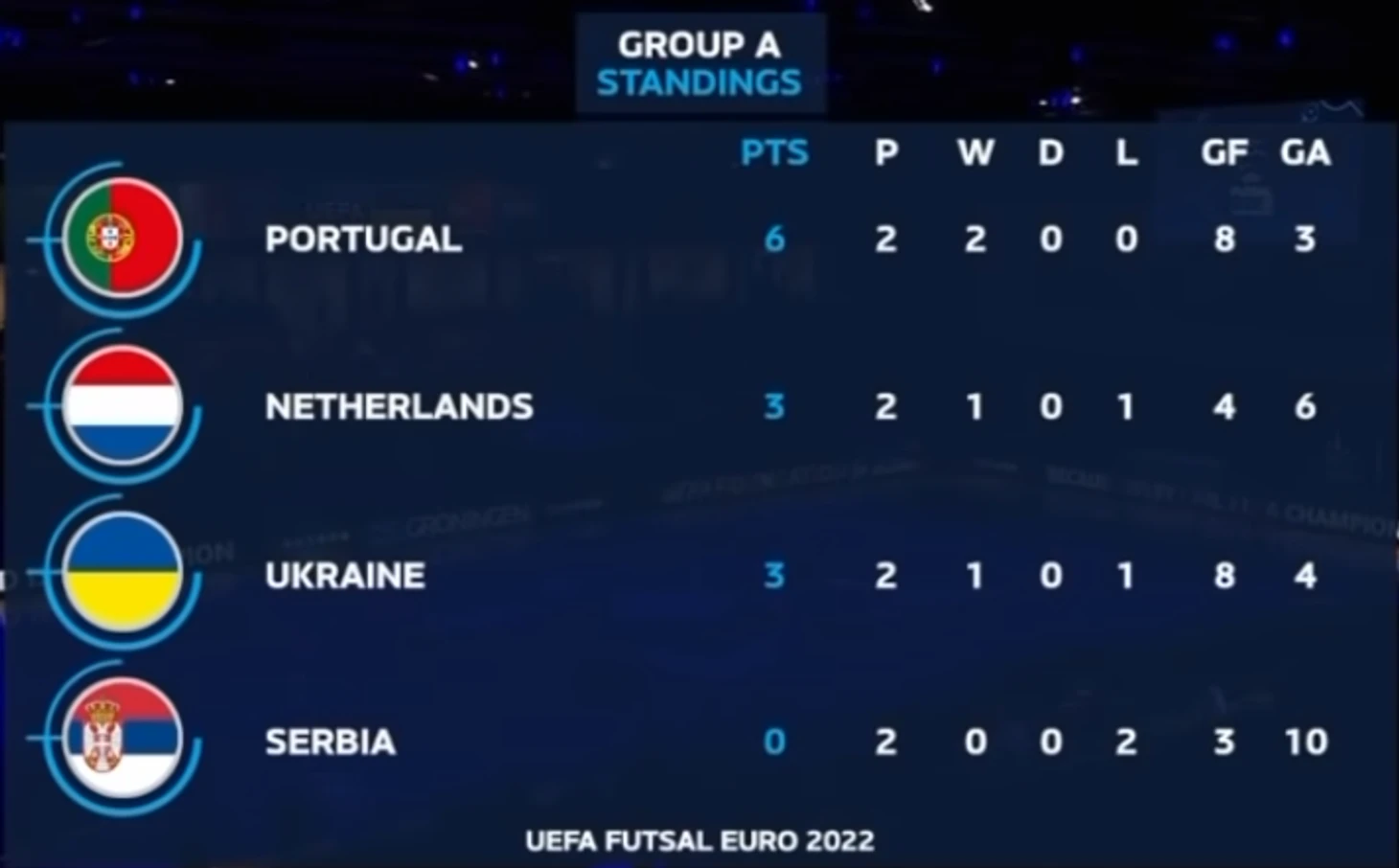 Оранжевые обыграли украинцев в первой встрече 3:2, а Португалия взяла верх над сербами (4:2). В следующем туре Украина разгромила Сербию 6:1, а действующие чемпионы мира и Европы победили Нидерланды 4:1. В заключительном туре хозяевам турнира хватило было и ничьей с Сербией, чтобы выйти из группы со второго места, если в параллельной встрече Украина проиграет Португалии.