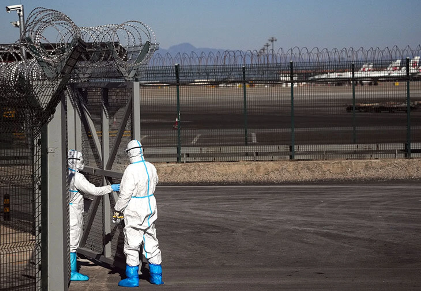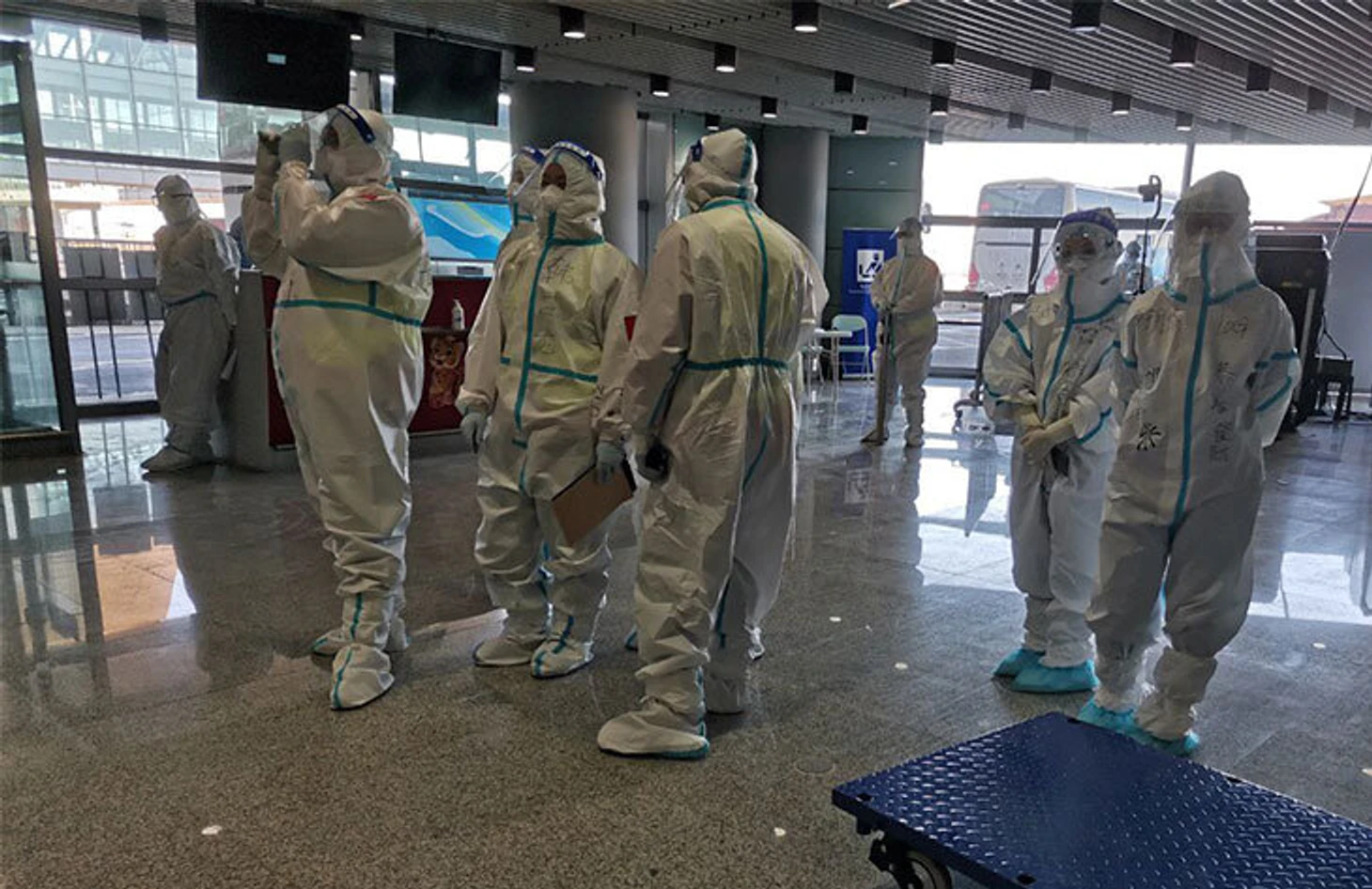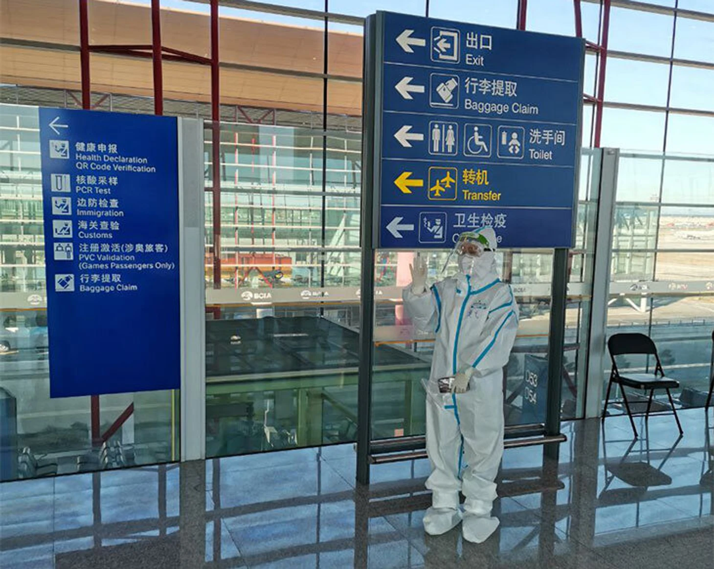 Первичный инструктаж от китайцев, замурованных в спецкостюмы, длится минуту. Дальше потоки ловко разводят и регулируют: тестирование, граница, получение аккредитации – очереди нет нигде.