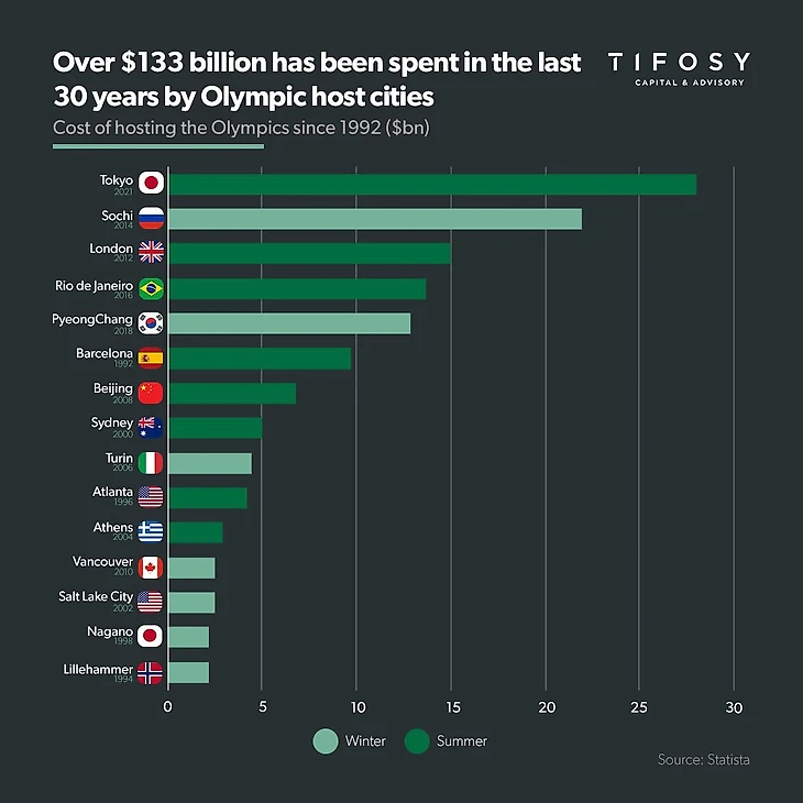 Олимпиада-2022 стартовала – самое время поговорить о деньгах. Заявленная Пекином стоимость Игр – 3,9 млрд долларов – одна из самых низких за всю историю проведения Олимпийских игр. В качестве сравнения: Олимпиада в Токио оценивалась в 28 млрд долларов, Игры в Сочи – в 22 млрд долларов (по подсчетам консалтинговой компании Tifosy, но есть и другие данные – об этом чуть ниже). А Олимпийские игры-2008 в том же Пекине стоили фантастических 42 млрд долларов.