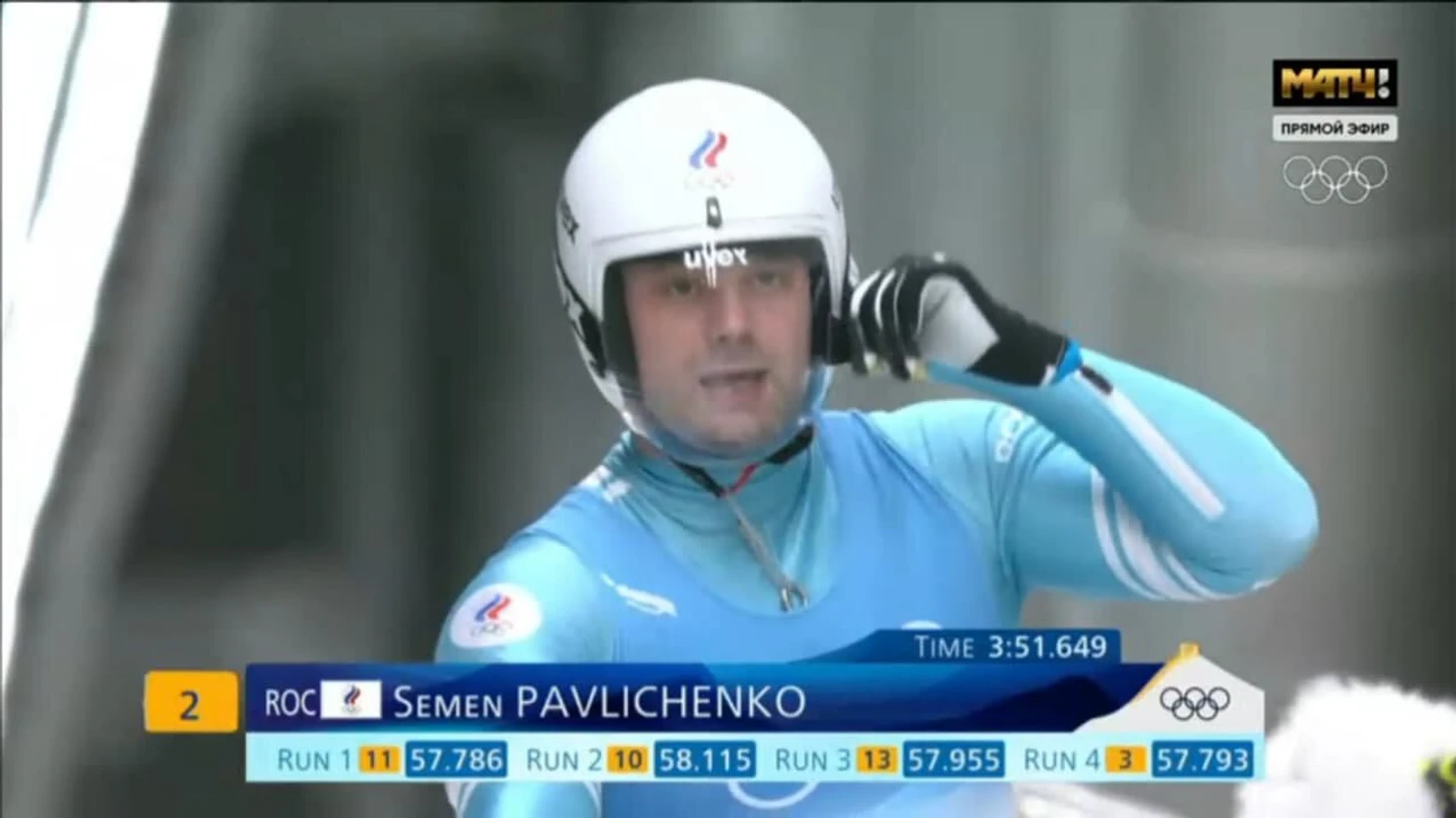 Роман Репилов выходит на промежуточное первое место! В сумме у него 3:51.634 - хотя он сам признается, что это не его предел, потому что есть проблемы с санями.