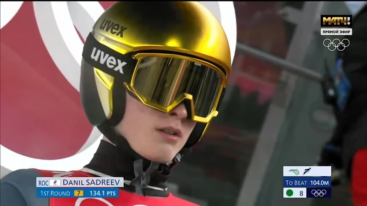 Данил Садреев прыгает на 107,5 м - и получает 134,1 по сумме баллов. Евгений Климов прыгает на 104 м - и получает 135 баллов.