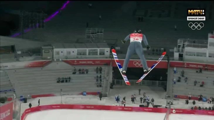 Смотрите, как летит Хадарин - со всеми трюками налетал на 64,73! Пока это седьмой результат. Но будет еще одна попытка - лучшая и идет в зачет.