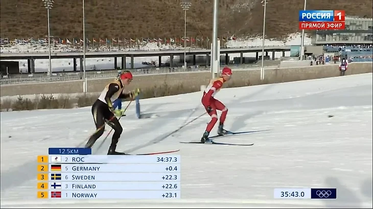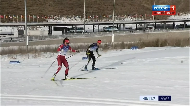 Татьяна Сорина просто убегает с соперницей от пелотона - формально наша лыжница на первом месте, но отставание немки тут номинальное.