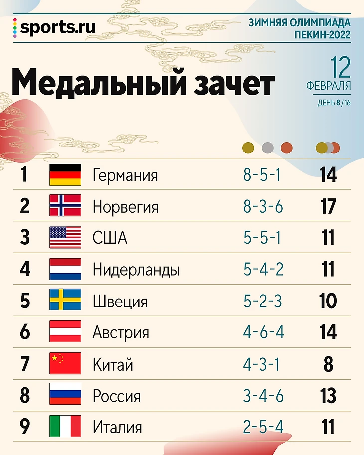 Многие медальные виды сегодня прошли без каких-то громких заявок с нашей стороны - и это печалит. Только одна награда в общий зачет - зато золотая! По общему количеству Россия - четвертая, а так - восьмая. Но до окончания Игр еще далеко.