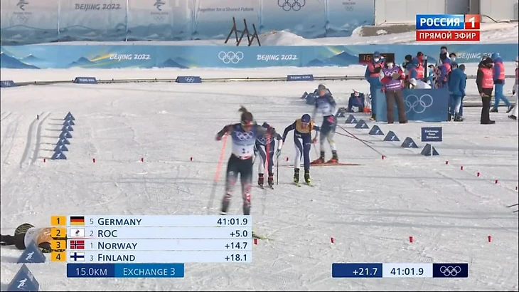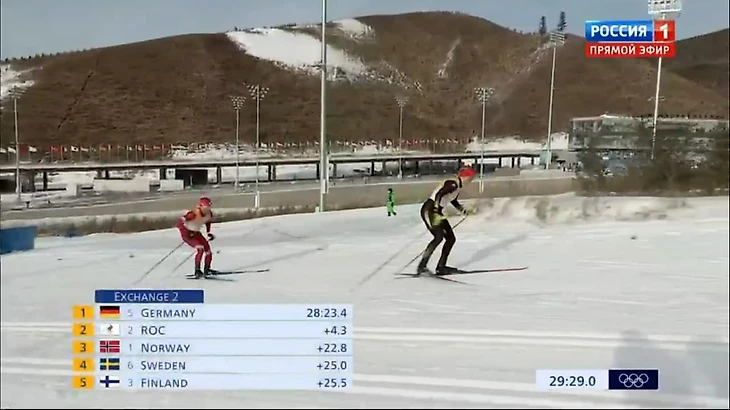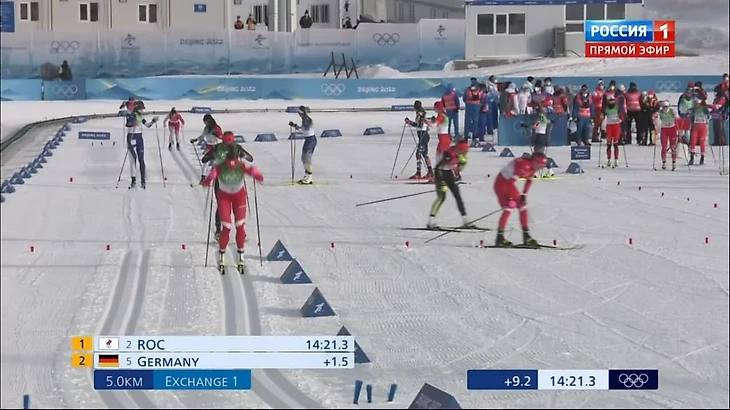 К передаче эстафеты нас уже нагнали немки, но все же пока Россия идет первой! Норвежки - восьмые, Йохауг предстоит задача со звездочкой, но, кажется, она и не такие решала.