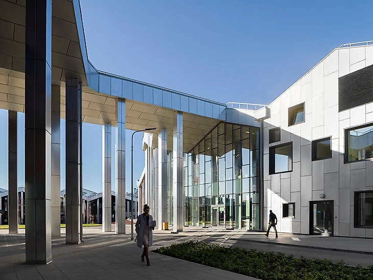 Во внешнем облике здания использован натуральный камень – юрский известняк и витражные конструкции с вертикальными солнцезащитными панелями. Архитектор проекта – группа «АБВ».