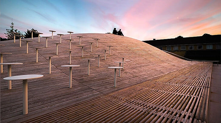 В итоге мягкая изогнутая деревянная конструкция снаружи стала неформальным местом для встреч. Край крыши выполнен в виде длинной социальной скамьи с легким доступом через двор и перфорирован небольшими окнами для проникновения дневного света во внутренние помещения. И, конечно, не обошлось без солнечных батарей, стратегически расположенных вокруг существующих зданий, которые обеспечивают отопление подземного зала.