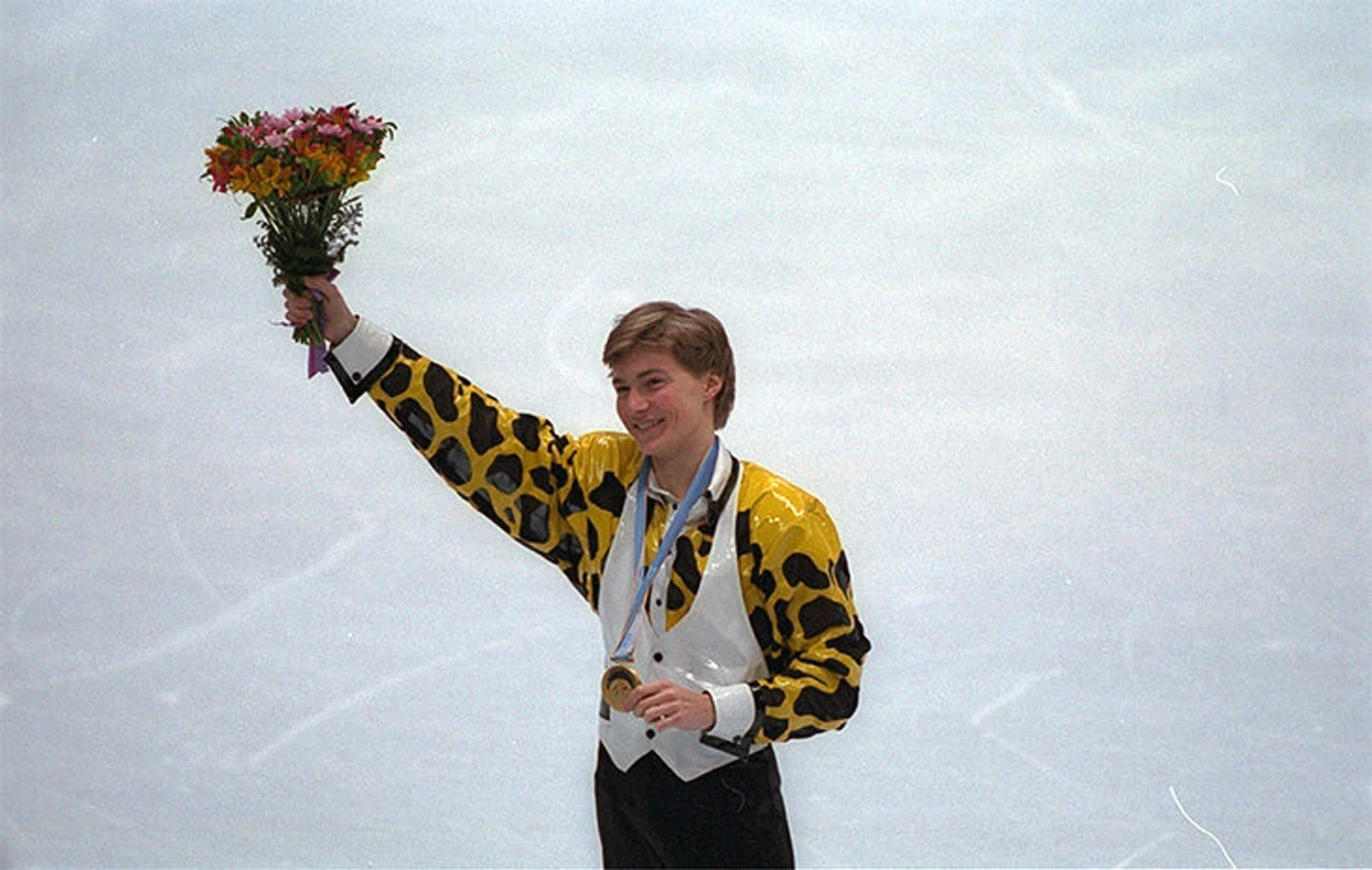 Наш фигурист выступал в необычном костюме жирафовой раскраски, запомнился красными щеками и взъерошенными светлыми волосами.