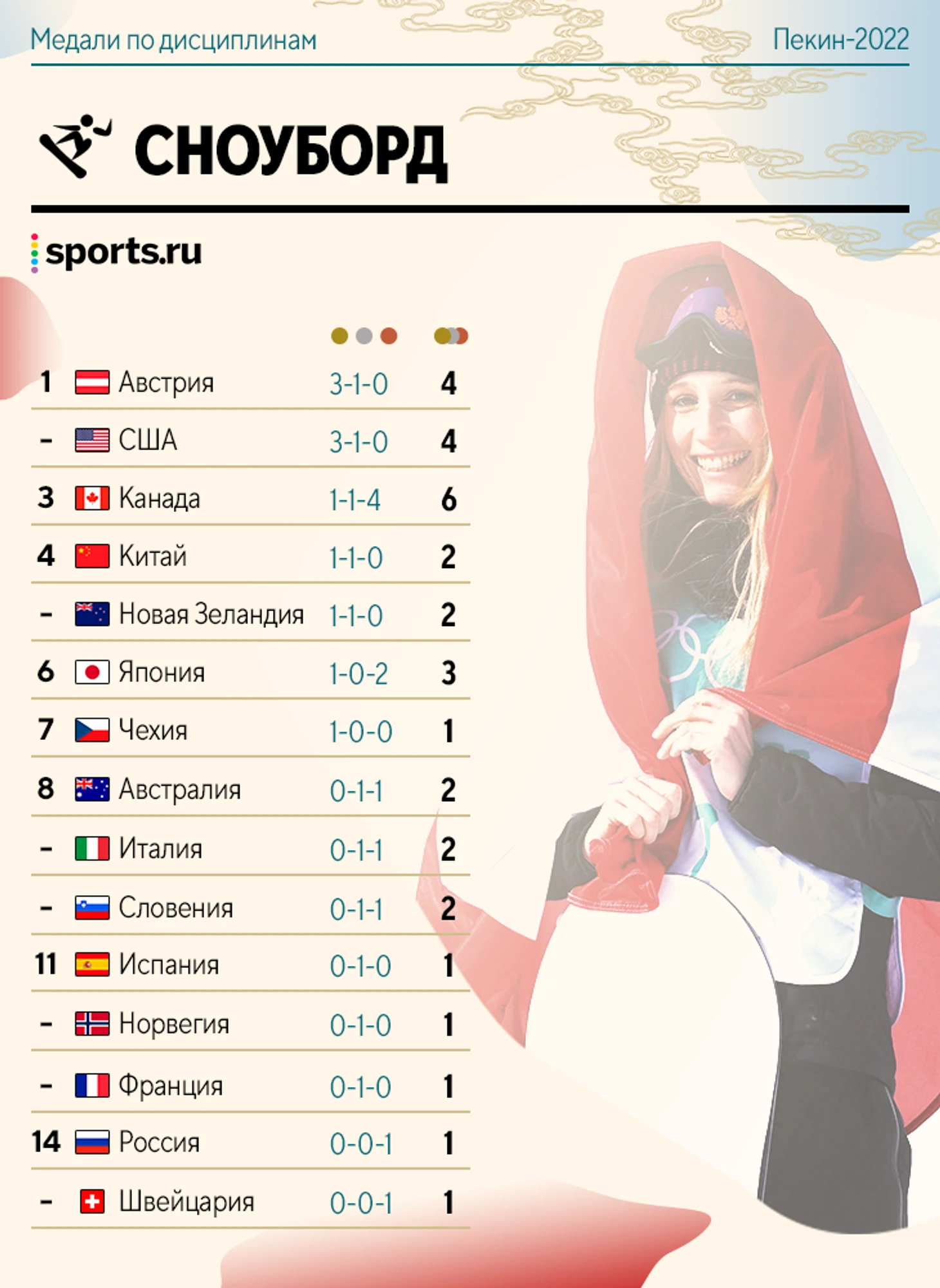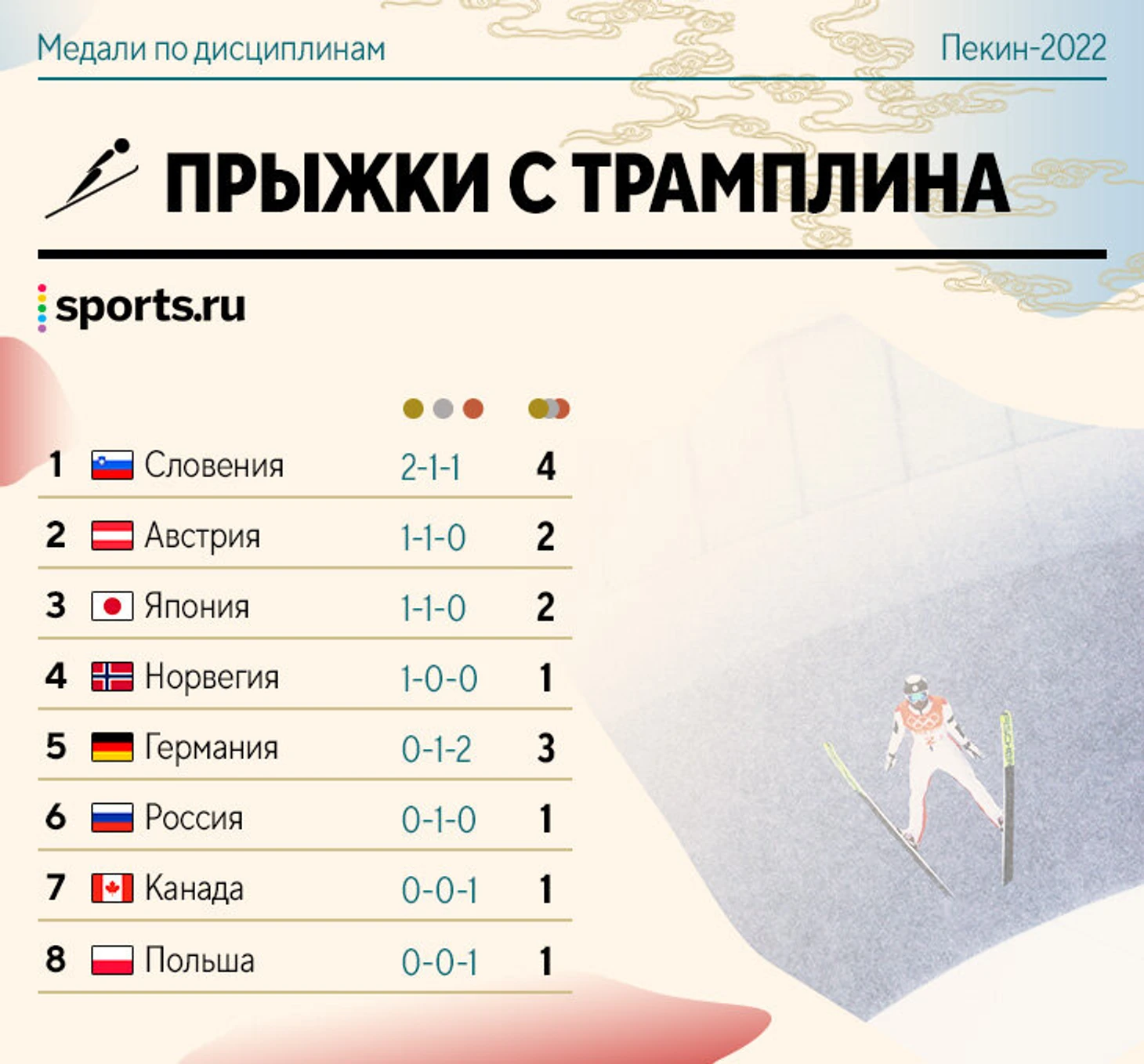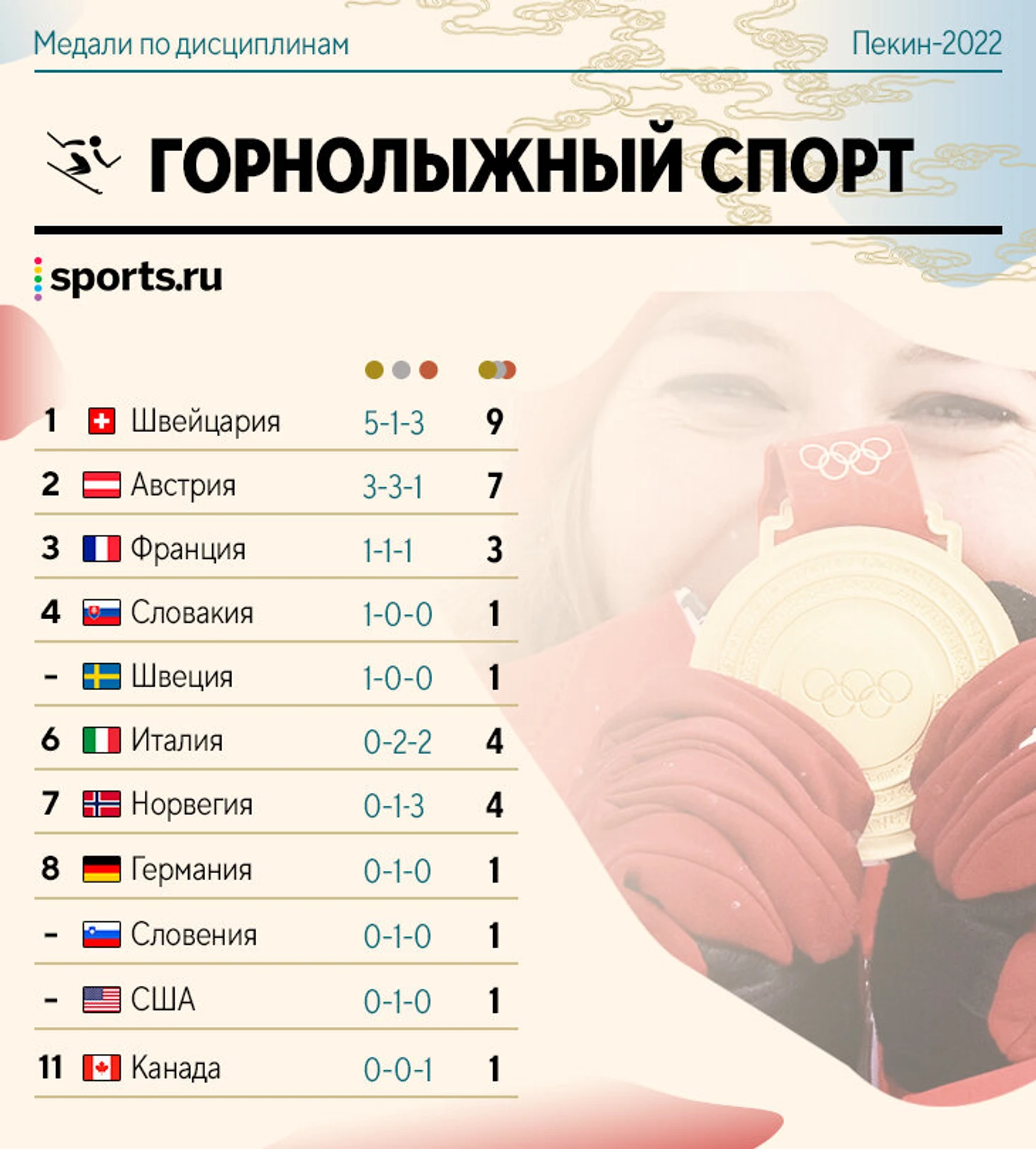 Давайте пройдемся по каждому (всего их 15) и проследим распределение медалей. Такой угол дает слегка другой взгляд на Пекин-2022 и подсвечивает страны, у которых получилось превзойти всех в отдельном виде спорта (например, Словения в прыжках с трамплина и Швейцария в горных лыжах).