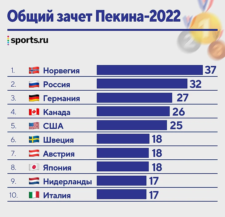 Полный медальный зачет всех участников Олимпиады-2022