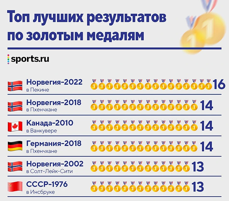 • Для Норвегии Пекин-2022 стал историческим успехом. Переписан рекорд зимних Олимпиад по золотым медалям – 16. Первое место до этого делили Норвегия и Германия (по 14 золотых в Пхенчхане-2018) и Канада-2010 (14).