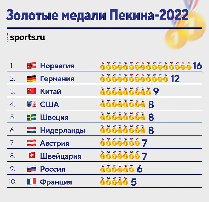 • По общему количеству наград Россия – вторая. Больше только у норвежцев. Хозяева Олимпиады китайцы – 11-е (15 медалей).