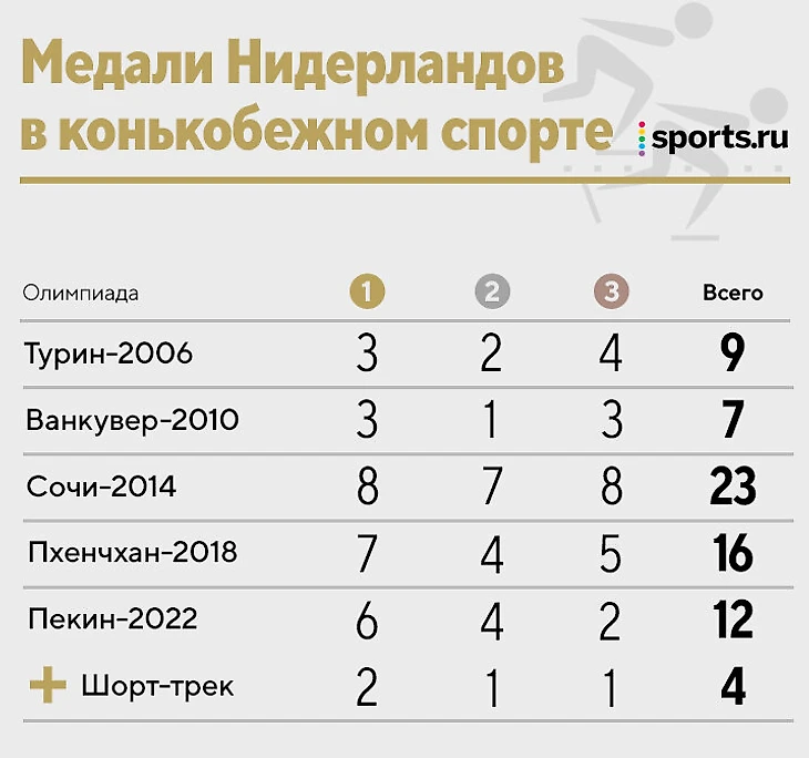 Нидерланды – цари конькобежного спорта. В Пекине они выиграли на овале 6 золотых, 4 серебряных и 2 бронзовых медали. Итого – 12. Другие страны не набрали более 5 наград (Япония и Канада), а золотых никто не завоевал больше 2 (Швеция).