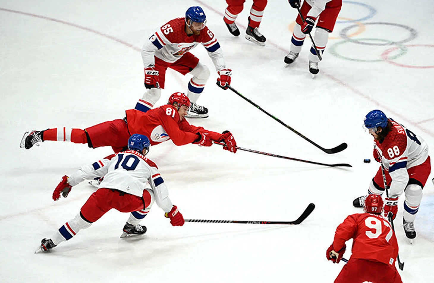 12 февраля. Хоккей. Арсений Грицюк из России, Роман Червенка и Войтех Мозик из Чехии.