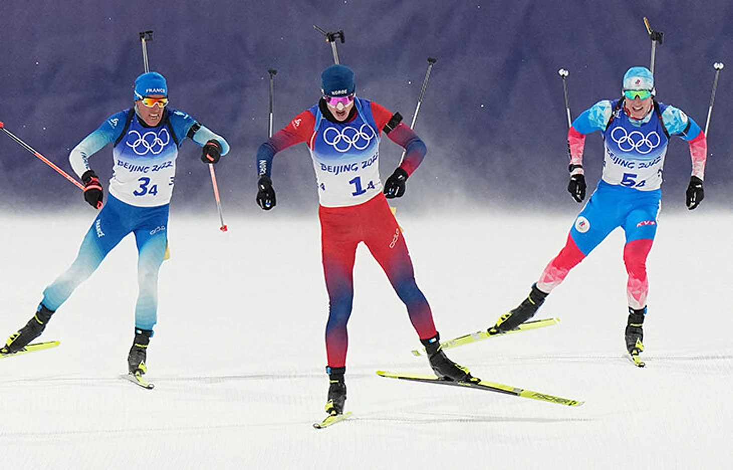 5 февраля. Биатлон, смешанная эстафета. Кентен Фийон-Майе из Франции, Йоханнес Бо из Норвегии и Эдуард Латыпов из России.