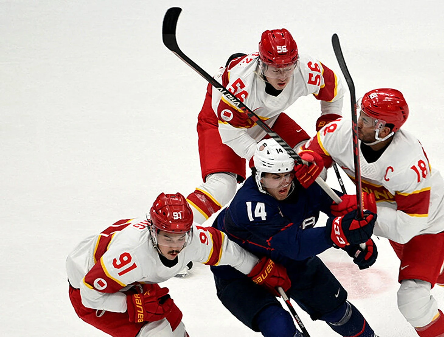 10 февраля. Хоккей. Брок Фэйбер из США в окружении игроков из сборной Китая.