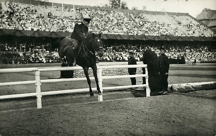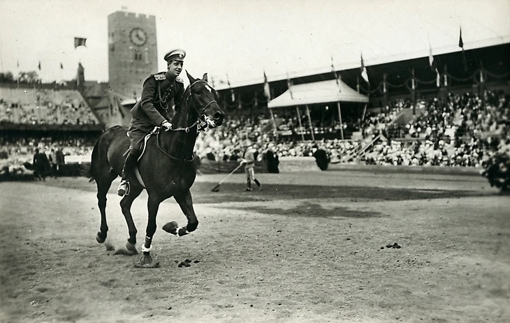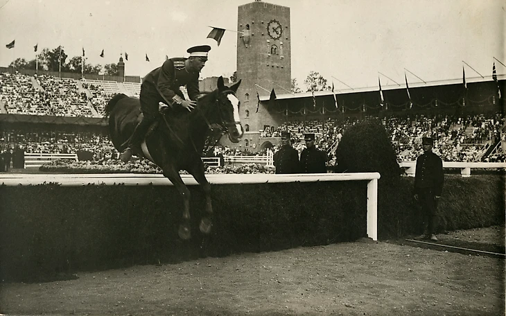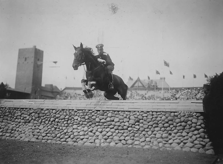 Июль 1912 года. Стокгольм. Олимпийский стадион. Капитан Александр Родзянко и Эрос. Он тоже соревновался в индивидуальном конкуре и в командном конкуре