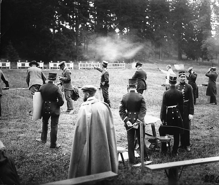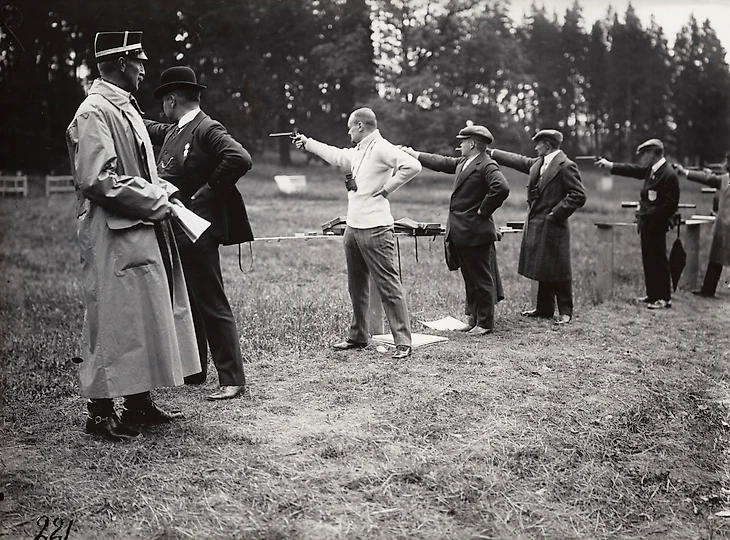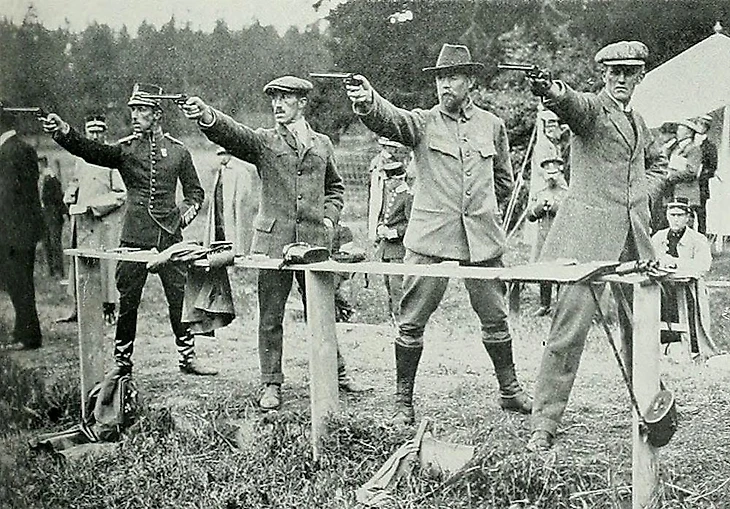 1912 год. Стокгольм. Олимпийские игры. Команда России (по мнению Шведской ассоциация содействия развитию спорта / SCIF) по стрельбе из пистолета на огневом рубеже (фото Хассельблад-Шоландера). Поручик Георгий Пантелеймонов, поручик лейб-гвардии Николай Мельницкий, подъесаул Павел Войлошников и капитан Амос Каш (Каше) завоевали серебро в командных соревнованиях по стрельбе из дуэльного пистолета на 30 м