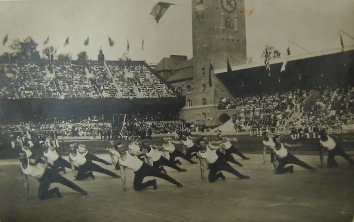 11 июля 1912 года. Стокгольм. Олимпийский стадион. Показательное выступление российской команды гимнастов, включавшее в себя элементы русской народной пляски (почтовая открытка) / фото auction.ru