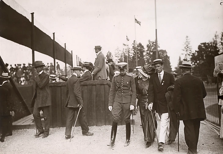 Июль 1912 года. Олимпийские игры. Великий князь Дмитрий Павлович (в центре). После выступления российской сборной в Стокгольме (предпоследнее место в общем зачете) именно он распорядился проводить в России свои олимпиады