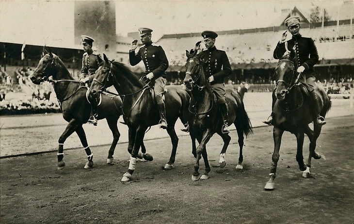 17 июля 1912 года. Стокгольм. Олимпийский стадион. Сборная команда России по преодолению препятствий (командные соревнования): Великий князь Дмитрий Павлович на Уните, Александр Родзянко на Эросе, Алексей Селихов на Тугеле и штабс-ротмистр Михаил Плешков на Иветте (почтовая открытка)