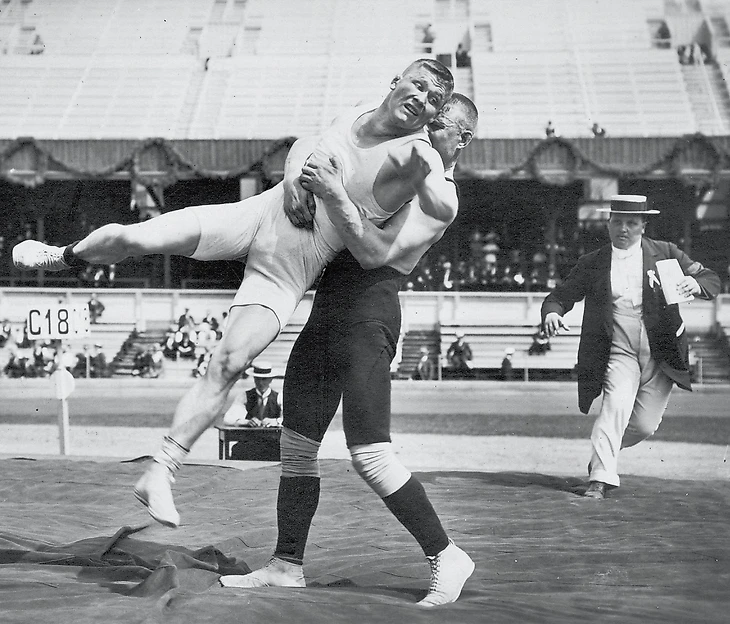 14 июля 1912 года. Стокгольм. Олимпийский стадион. Классическая (греко-римская) борьба. Полуфинал в среднем весе (до 75 кг): Мартин Клейн (Россия) - Альфред Асикайнен (Финляндия). «Асикайнен берет русского борца за задний пояс» (подпись к фото из журнале «Физкультура и спорт» № 9-10 за 1937 год). По регламенту турнира на схватку отводилось 30 минут. По ее окончании судьи могли назначить еще один 30-минутный раунд и так далее, без ограничения количества дополнительных раундов. Поединок борца санкт-петербургского клуба «Санитас» (на снимке он слева; некоторые зарубежные сайты, считают что справа) с действующим чемпионов мира с учетом перерывов продолжался 11 часов 40 минут (без них чистое время поединка составляет 10 часов 15 минут; после восьмого часа борьбы перерывы были отменены - арбитры стали усложнять) пока Клейну не удалось прижать финна к ковру. Это случилось после того, как судьи перевели борцов в партер. До этого они надеялись выявить победителя по баллам в 15-минутном финальном раунде (вечером затянувшуюся дуэль перевели в манеж для верховой езды). Не получилось - ничья. В партере каждый из них по три минуты боролся сверху, а нижний мог только защищаться. Мартин, когда настала его очередь атаковать, смог перевернуть Асикайнена на спину и выиграть. Наш борец был настолько измотан победным поединком (стал самым продолжительным борцовской схваткой в истории спорта), что на следующий день не мог бороться (кроме того у него была травмирована рука) за золото со шведом Класом Юханссоном. Российская сторона пыталась убедить Оргкомитет Игр перенести поединок хотя бы на один день, но получила отказ. (Команда Финляндии, представлявшая на Играх Великое княжество Финляндское - генерал-губернаторство в составе Российской империи с правами автономии, стала членом МОК, не смотря на протесты России, благодаря действиям шведских спортивных деятелей Виктора Балька и Кларенса фон Розена). Всего в составе команды России по борьбе было одиннадцать человек: Александр Анкудинов, Александр Мезит и Павел Павлович в легчайшем весе (борцы весом до 60 кг), Георг Бауман, Оскар Каплюр и Август Кипасто в легком (от 60 до 67,5 кг), Мартин Клейн, Янис Полис и Александр Северов в среднем (от 67,5 до 75,5 кг), Август Пиккер в полутяжелом (от 75,5 до 82,5 кг) и Николай Фарнаст в тяжелом весе (борцы свыше 82,5 кг). Мезит, Кипасто, Полис, Пиккер и Фарнаст представляли Прибалтийский край, все остальные - Петербург (Бауман - чемпион мира 1913 года в легком весе; Каплюр - чемпион Северной Европы 1913 года в среднем весе; Клейн - абсолютный чемпион Петербурга; Северов - неоднократный чемпион России и центральный полузащитник футбольного клуба «Меркур»). Почтовая открытка (фото stamps.ru)