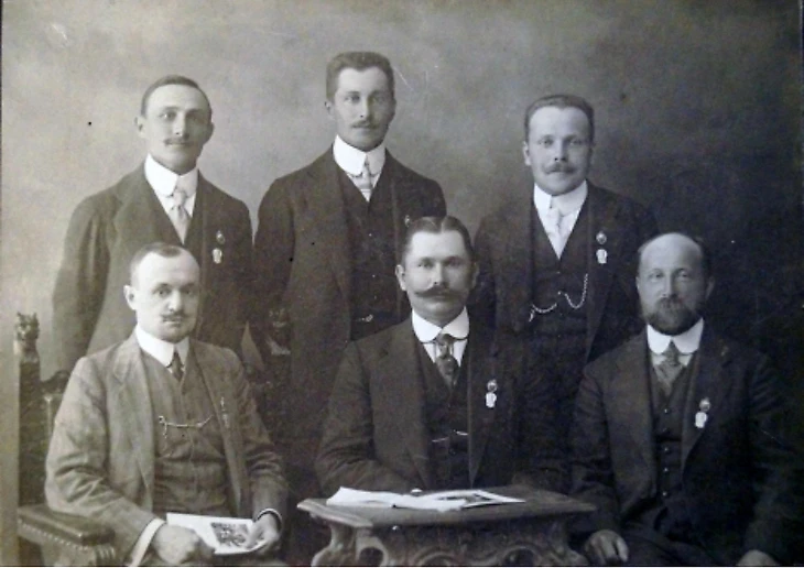 26 июня 1912 года. Члены сборной России по стрельбе: первый справа в нижнем ряду - Амос Каш, первый слева в нижнем ряду- Георгий Пантелеймонов (предположительно); стоят: первый справа в верхнем ряду - Николай Мельницкий, первый слева в верхнем ряду- Павел Войлошников (предположительно). Фото из личного архива внучки А.М. Каша Аллы Кулевской / sportrg.ru