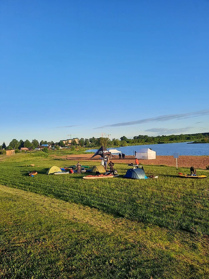 Старт с пляжа в деревне Мокшино (рядом с Завидово) и финиш на пляже в г. Конаково. До самой Волги около 5км по небольшим рекам. Утром вода спокойная, мягкая. Особенно часов до 10 утра. Ближе к обеду поднялся ветер, нагонявший слева боковую волну. Но самые большие неудобства доставляли небольшие катера и круизные пароходы, которые курсировали недалеко от форватера. С ветром (западный, юго-западный), кстати, большую часть нам повезло - он все таки немного помогал (ну или хотя бы не сильно мешал). Температура воды - от 18 до 21 градуса по ощущениям участников и замерам. Течение практически отсутствует.
