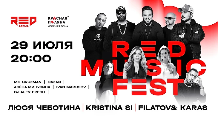 Грандиозный музыкальный фестиваль RED MUSIC FEST состоится 29 июля. Лидеры музыкальных чартов соберутся в RED ARENA, чтобы провести жаркий летний фестиваль в горах. Сразу несколько мегапопулярных исполнителей выйдут на одну сцену: Люся Чеботина, Filatov & Karas, Kristina Si, МС GRUZMAN, GAZAN, Алёна Минулина, Ivan Marusov, DJ Alex Fresh.