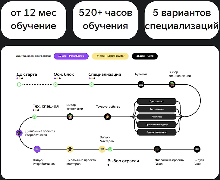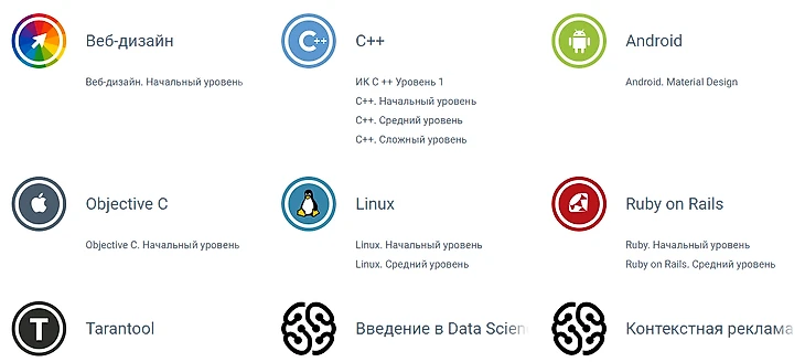 Портал ориентирован на подготовку специалистов IT профессий. Масштабные образовательные пакеты после окончания дают одновременно несколько специализаций и включают в программу обучения знания из многих IT-сфер, таких как:
