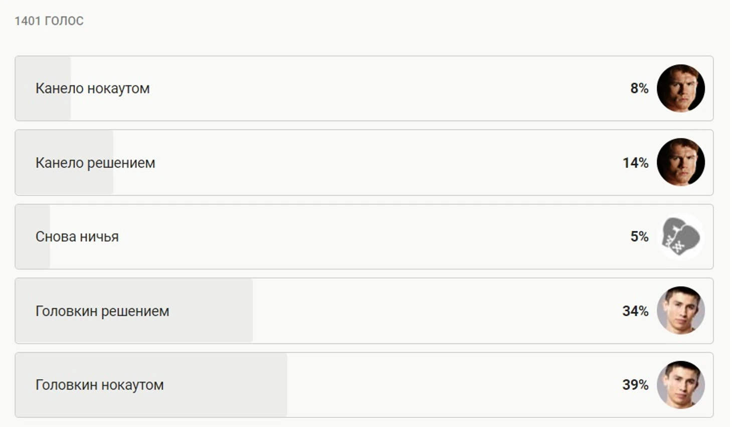 Почти 40% опрошенных считают, что Головкин одолеет мексиканца нокаутом. Еще 35% респондентов уверенны, что судейское решение будет в пользу казахстанского бойца.
