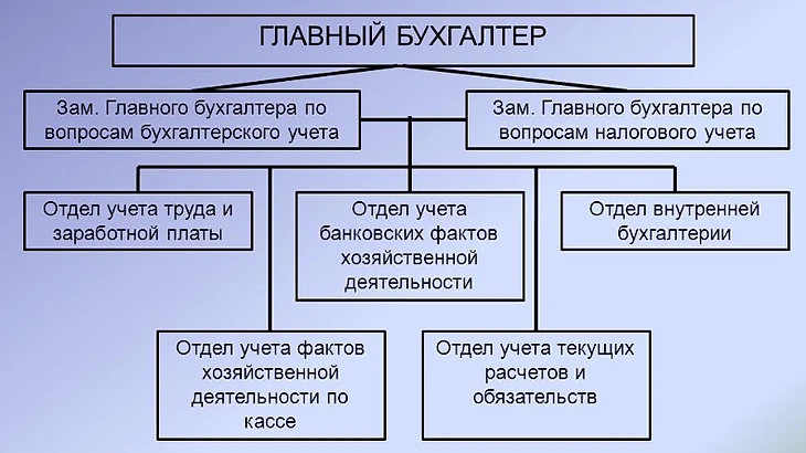 В небольших организациях бухгалтерия может состоять из одного работника. Крупные компании имеют в штате целый департамент, где каждый специалист отвечает за конкретный участок. Отдел возглавляет главный бухгалтер, который контролирует работу подчиненных, распределяет между ними обязанности и коммуницирует с руководителем. Помимо профессиональных знаний и рабочего опыта эта должность требует управленческих способностей.