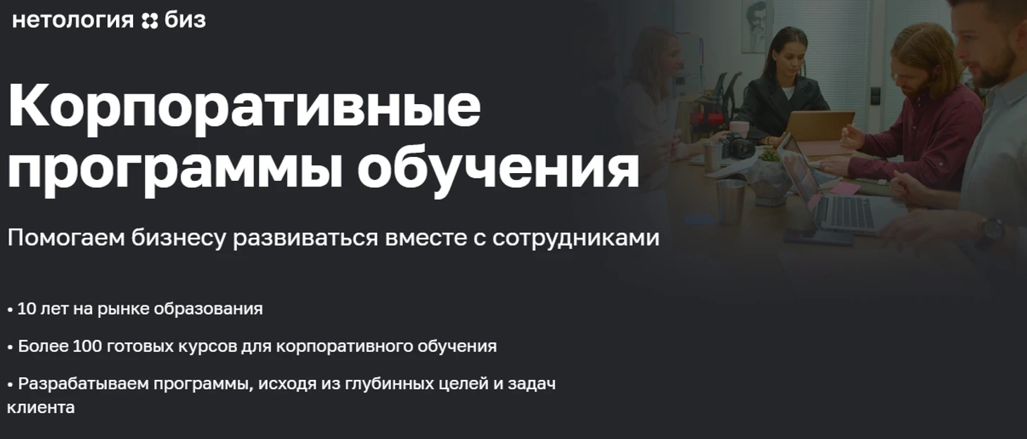 Нетология имеет линейку корпоративного обучения. Коллективам предлагают более 100 готовых видеокурсов, которые адаптируют к особенностям конкретного предприятия в кратчайшие сроки. Их можно дополнить интенсивами и воркшопами с целью развития практических навыков сотрудников. Продолжительность – от 1 недели до месяца.