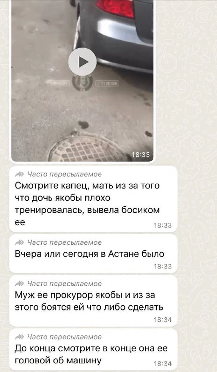 По информации журналиста Михаила Козачкова, в видеоролике жена сотрудника генпрокуратуры Кадыржана Маматаева – Алмагуль и ее дочь гимнастка Аяла.