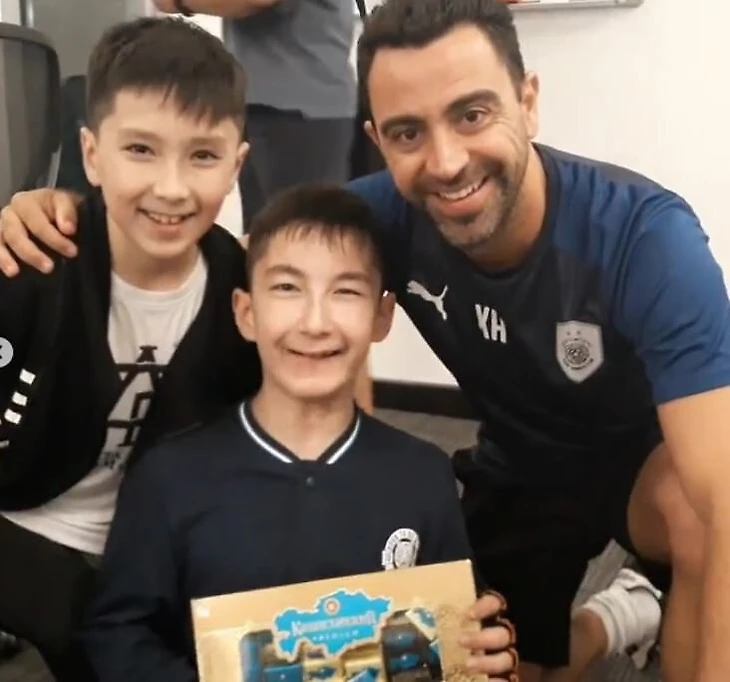 Хави тоже не остался без подарка, получив от Али золотую упаковку маленьких шоколадок с казахстанским флагом.