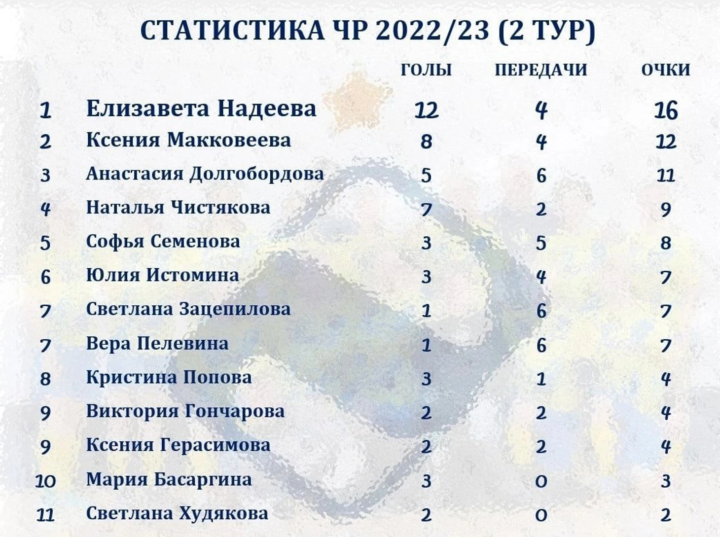 Лидерство Елизаветы Надеевой (16 очков, 12 голов!!!). Первые очки для дебютантки Виктории Гончаровой. Смотрите ниже все цифры.