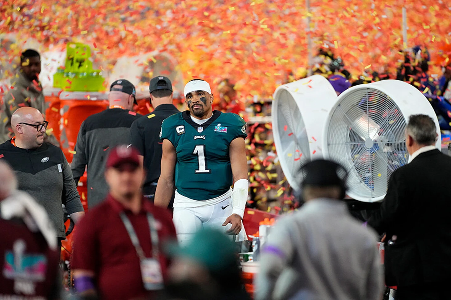 12 февраля. А вот у Джейлена Хертса братьев рядом не было, поэтому он выглядит еще грустнее. Где-то за спиной праздник, а тут какие-то нелепые вентиляторы.