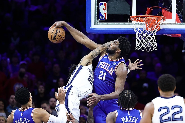 23 февраля. Красочный момент с двумя суперзвездами НБА: Джоэль Эмбиид из «Филадельфии» в концовке игры ставит мощный блокшот Джа Морэнту из «Мемфиса».