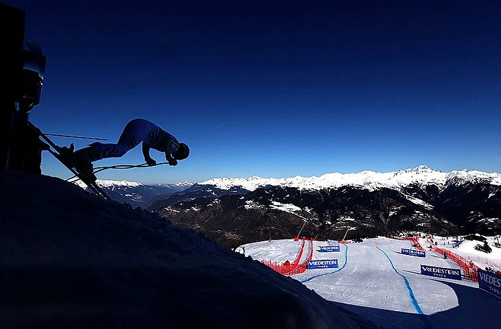 10 февраля. Куршевель, вид на Альпы. Горнолыжник Доминик Швайгер за мгновение до спуска.