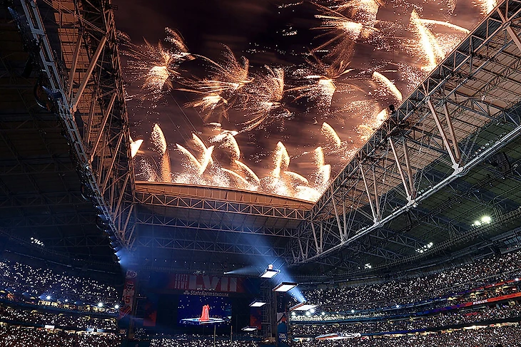 12 декабря. Вид на главное шоу года в спорте. Рианна на подвешенной платформе выступает в перерыве Супербоула.