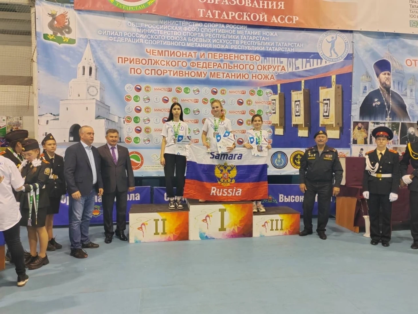 Наших спортсменов поприветствовали более 40 почётных гостей, родных и близких, боевых товарищей и друзей отца Анатолия: 1. Супруга иерея Анатолия Григорьева - Нина Владимировна Григорьева, дети: Лидия, Параскева, Ксения и Николай. 2. Президент Филиала Российского Союза боевых искусств по Республике Татарстан - Фархат Гусманович Хуснутдинов. 3. Президент Федерации спортивного метания ножа России - Андрей Александрович Трохов. 4. Военный комиссар Республики Татарстан - Сергей Николаевич Погодин. 5. Председатель президиума Союза общественных деятелей Республики Татарстан, руководитель Исполкома Российского Союза боевых искусств по Республике Татарстан, заслуженный тренер - Александр Александрович Даренков. 9. Президент Республиканских спортивных федераций по: кобудо, сито-рю, спортивному метанию ножа - Сергей Иванович Лисютин и многие другие. Прошла Знаменная группа. Выступили с показательными выступлениями воспитанники Военно-патриотического клуба "Тайфун" и спортсмены Федерации каратэ-до годзю-рю и наши метатели - Чемпионы мира по спортивному метанию ножа. 8 спортсменов выполнили норматив мастера спорта России: - Щежина Анастасия (Самарская область); - Дылина Диана (Самарская область); - Харитонов Александр (Нижегородская область); - Карпова Диана (Самарская область); - Фролова Анастасия (Самарская область); - Самков Владислав (Республика Татарстан); - Брагин Владимир (Самарская область); - Седышев Михаил (Самарская область). По итогам соревнований места распределились следующим образом. Мальчики 10-11 лет, дистанция 3 метра: 1 место – Быков Юрий, Удмуртская Республика, 240 баллов.